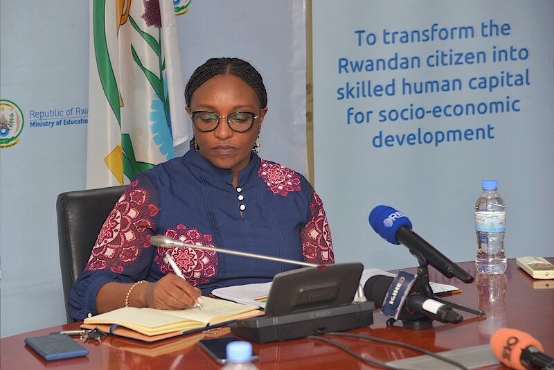 The Honorable Minister of Education Dr. Valentine UWAMARIYA noting down inquiries from the media during the publication of P6 and O'Level Examination Results (A photo taken by PRO/NESA)